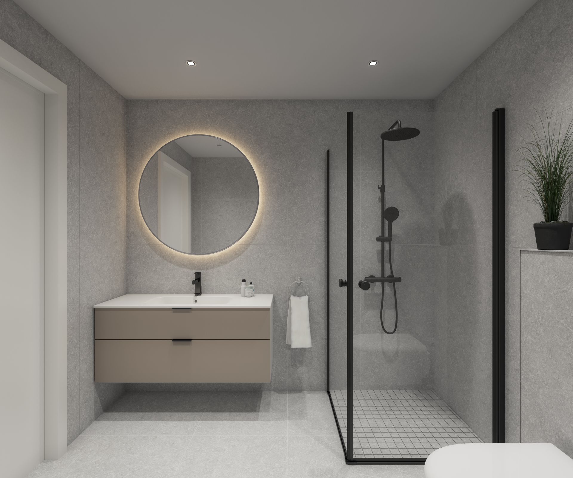 I Fagerhaug Bolig er det lagt vekt på gjennomgående god standard og en helhetlig fargepalett som harmonerer fra benkeplate til flis, gulv og veggfarge. Alle bad leveres med storformat 60x60 fliser som standard, noe som gir et moderne og stilrent uttrykk. Kjøkken fra kvalitetsleverandøren HTH med integrerte hvitevarer fra AEG er standard i både leiligheter og rekkehus. Det er valgt høyttrykkslaminat med brede og lange bord som standard gulv. På bad leveres baderomsmøbler fra HTH med rundt speil og integrert belysning, slik at du får en funksjonell og innbydende start på dagen.
